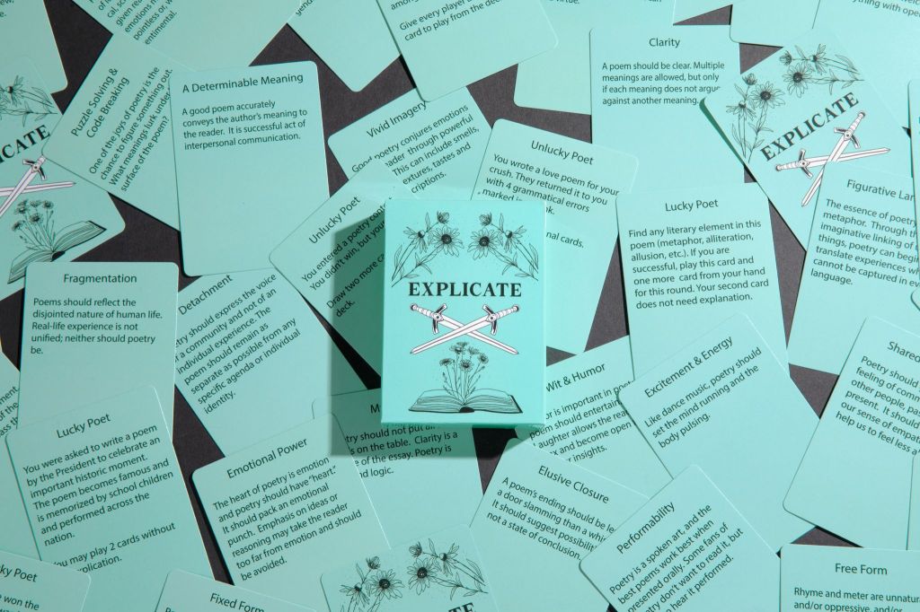 I’m a frequent teacher, sometimes poet and occasional gamer. Once in a while, these identities collide. One such collision produced what I’m sharing today: Explicate, The Poetry Analysis Card Game.