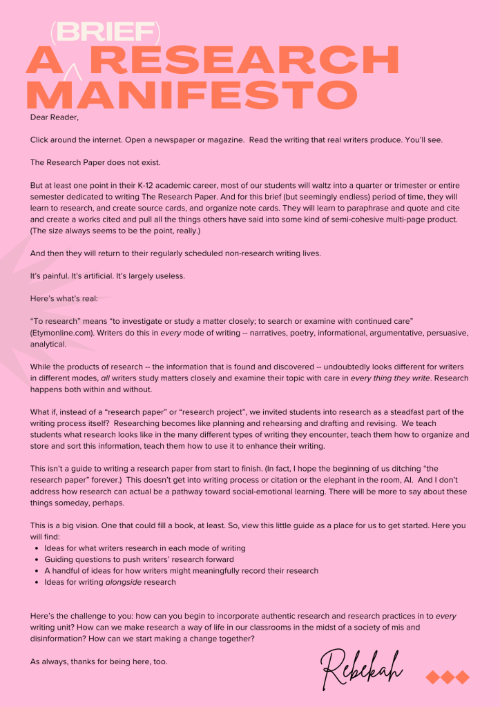 I’ve been working on an 11-page digital primer to begin changing the way we think about research-writing. No more semester-long research papers, rife with inauthentic, teacher-driven rules and procedures. Here’s a place for all of us to start.