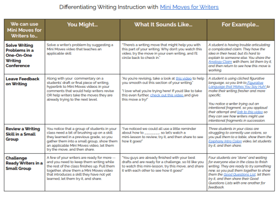 Download our FREE 10-page Quick Start Guide We’ve made it even easier to use Mini Moves for Writers in your classroom with a free 10-page quick start guide — full of ideas for incorporating our video writing mini-lessons into your curriculum! We’re releasing two new writing lessons each week! Make sure to subscribe so that […]