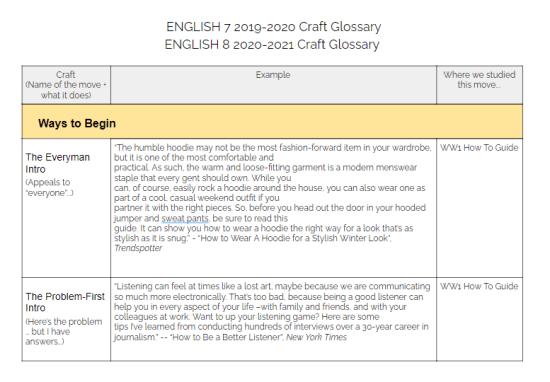What Comes After Mentor Text? Class Writing Moves Glossaries