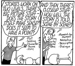 Closeup elements are how the story is told. Big Picture elements are the story itself.